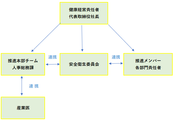 ▽薬糧開発株式会社では、代表取締役社長が健康経営責任者となり、健康経営を牽引するとともに、社内では人事総務部の推進本部チームが中心となり、産業医や各部署の推進メンバーと連携し、従業員の健康づくりを推進していきます。